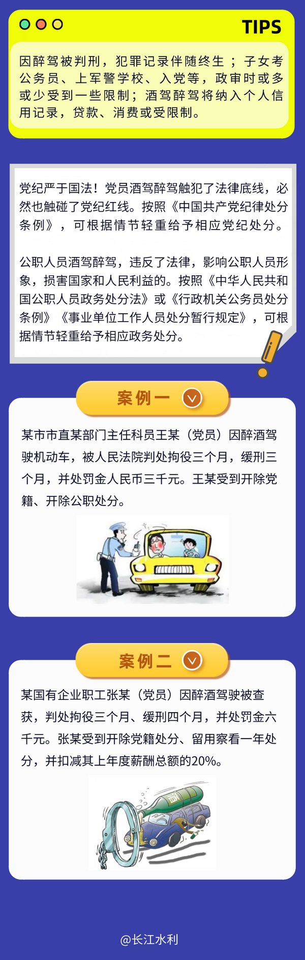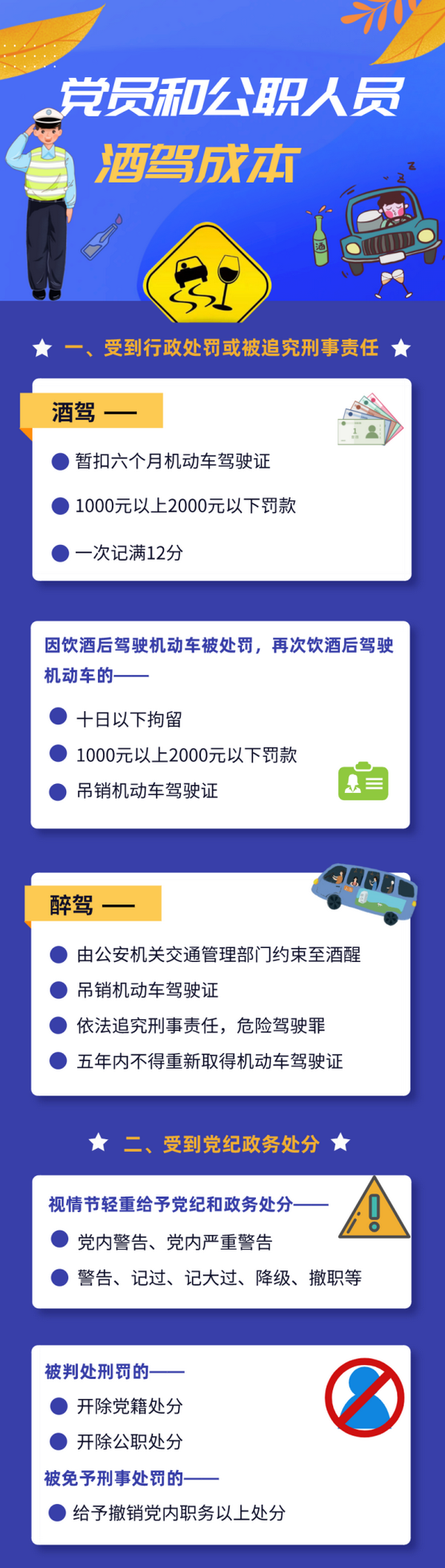 【一图读懂】党员和公职人员违法成本(酒驾篇) 来源:长江委纪检组 直属机关党委(纪委) 发布时间:2021-07-29 浏览数: 次 【字体:小 大】 编者按:为进一步深化党纪国法教育,从源头上预防非职务违法犯罪,按照长江委党组部署,委纪检组、直属机关党委(纪委)、宣传中心联合策划推出“一图读懂党员和公职人员违法成本”图解,以案明纪、以案释法,教育引导党员干部职工从反面典型案件中汲取教训,强化“八小时以外”的自我规范和约束,做到遵纪守法。 【打印正文】 分享到: