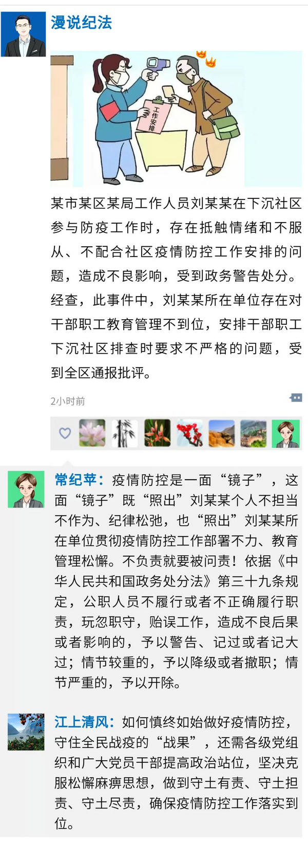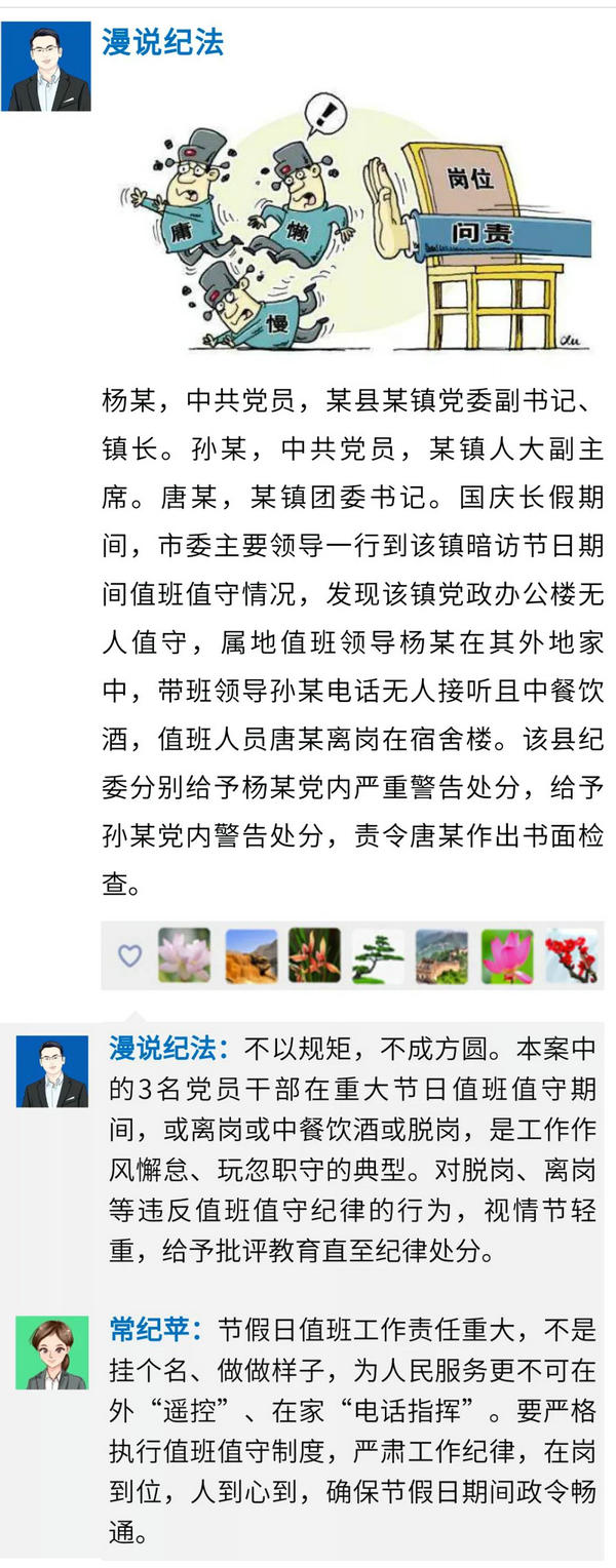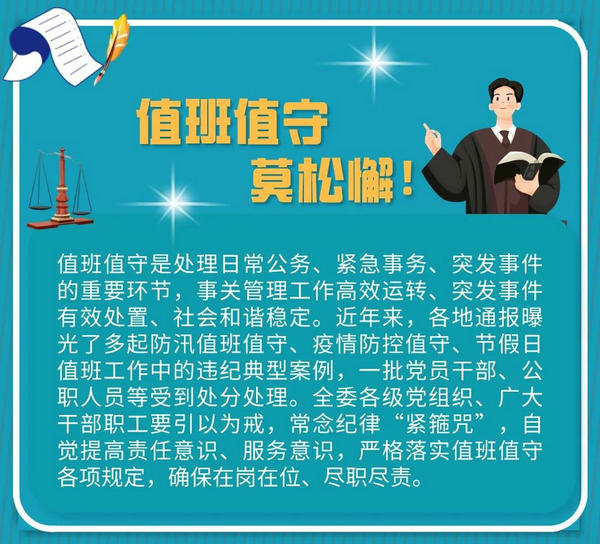 【漫说纪法】值班值守莫松懈! 来源:长江委纪检组 直属机关党委(纪委) 宣传中心 发布时间:2021-09-07 浏览数: 次 【字体:小 大】 习近平总书记高度重视警示教育工作,多次发表重要讲话、作出重要批示,强调要深入剖析违纪违法干部的典型案例,发挥警示、震慑、教育作用。按照长江委党组部署,委纪检组、直属机关党委(纪委)联合宣传中心特别开设“漫说纪法”栏目,通过典型案例剖析,以案释纪、以案说法、以案示警、以案促改,教育引导广大干部职工筑牢思想防线,严守纪法底线。 【打印正文】 分享到: