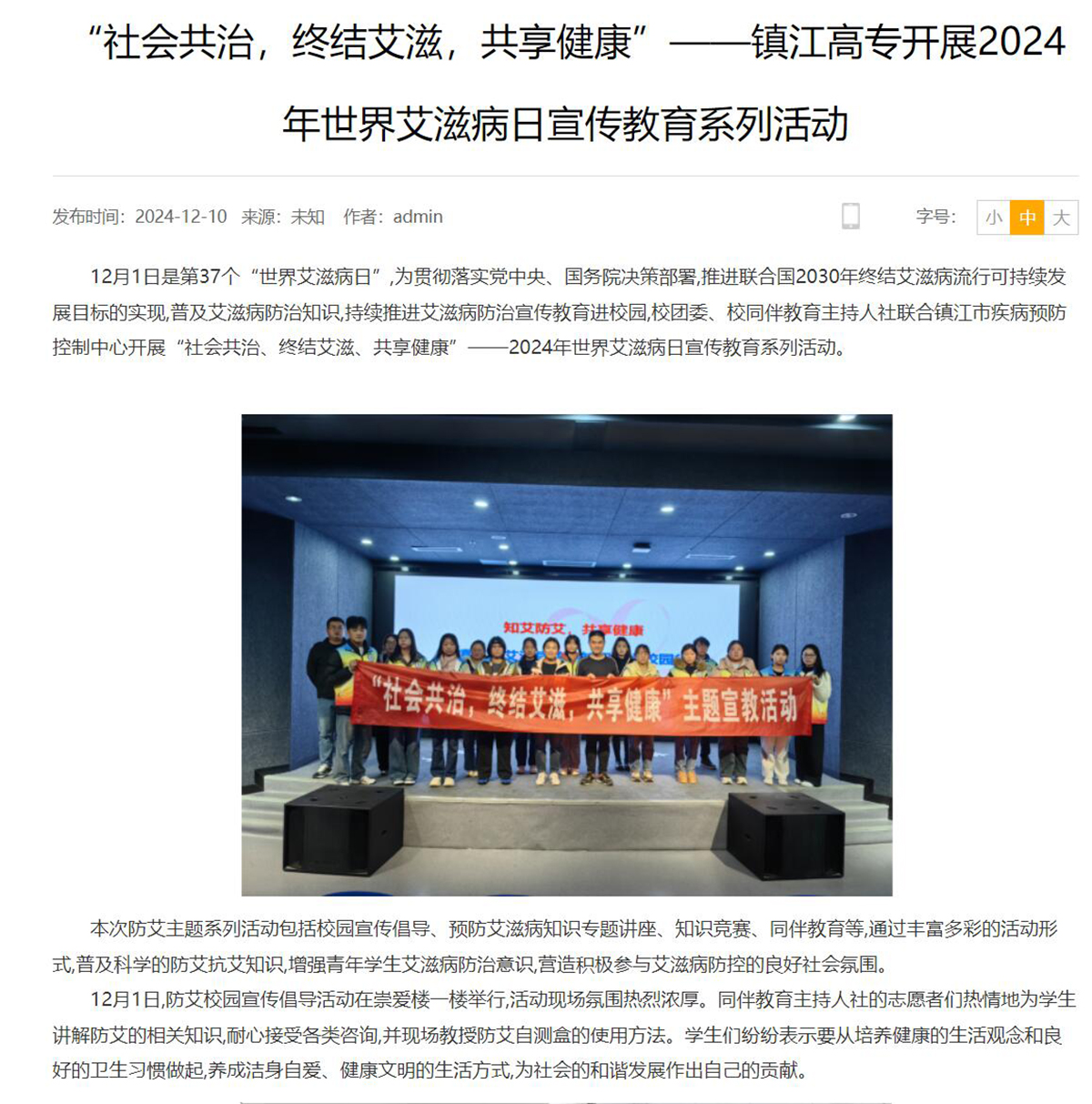 健康网资讯|“社会共治,终结艾滋,共享健康”——镇江高专开展2024年世界艾滋病日宣传教育系列活动 信息来源:团委发布时间:24.12.11阅读次数:4422 媒体链接:健康网资讯:http://jkwnews.net/news/20241210/1004.html