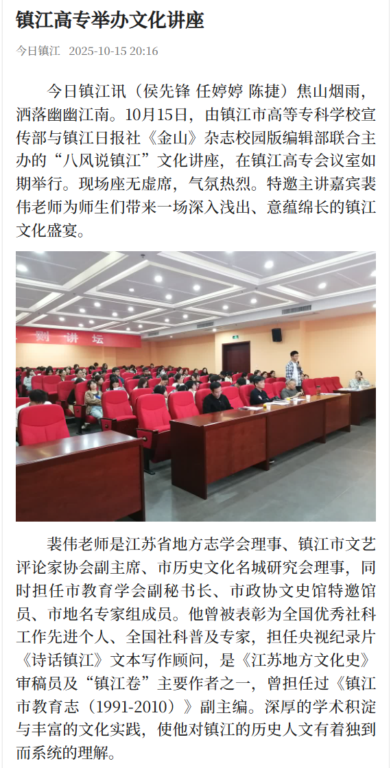 今日镇江|镇江高专举办文化讲座 信息来源:zjgz发布时间:25.10.16阅读次数:162 媒体链接:今日镇江:https://h5.jrzjapp.cn/davmu/mobile.html?url=https://h5.jrzjapp.cn/davmu/share/holly/doc/2025/10/VLBavCeyP/index.html