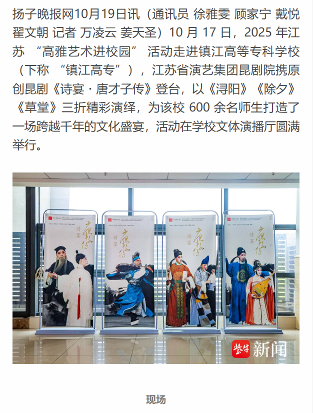紫牛新闻|昆剧《诗宴・唐才子传》登陆镇江高专,600 师生共赴千年文化美育之约 信息来源:校团委发布时间:25.10.20阅读次数:187 媒体链接:紫牛新闻:https://wap.yzwb.net/wap/news/4812148.html