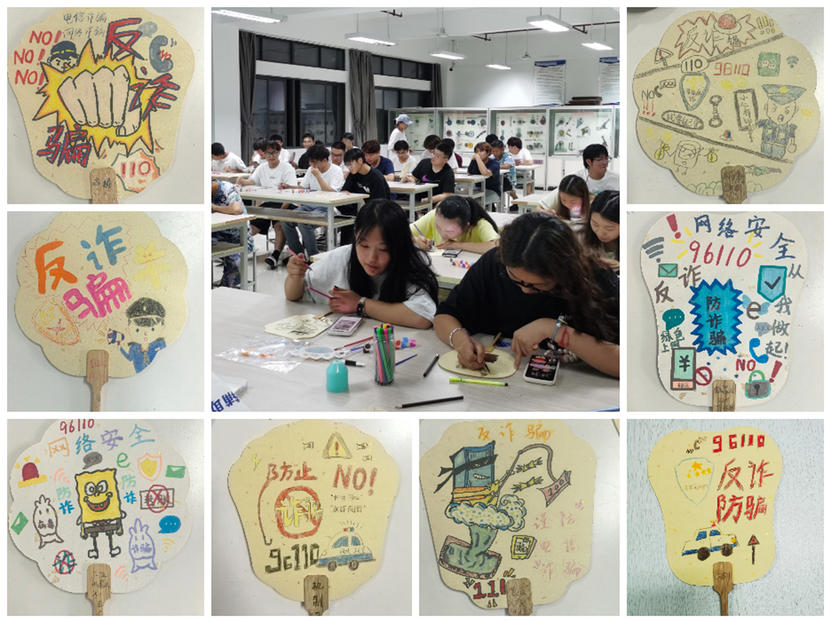 为提高大一新生反诈意识、增强防骗能力、筑牢安全防线,近期,现代装备制造学院组织2025级新生开展了“‘画’说反诈,‘扇’于防骗”安全教育活动。 本次活动以“反诈防骗”为主题,采用创意绘画的形式开展,将画艺展示与安全教育相结合,活动现场气氛活跃。同学们充分发挥创意,在空白扇面上写下醒目的“反诈防骗”警示标语,并配上漫画加以提醒,大家还互相交流扇面上绘出各类反诈警示图画,分享“反诈防骗”学习心得