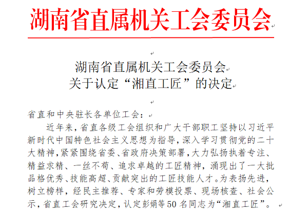 近日,湖南省直属机关工会委员会发布《关于认定“湘直工匠”的决定》,公司江垭水电站检修部张桉榕同志荣获“湘直工匠”称号。