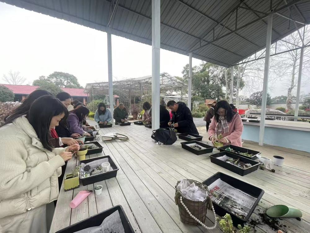 活动开始,老师向大家简单地介绍了多肉的常见种类,并告诉大家种植多肉的方法和顺序。活动中,大家精心挑选喜爱的花盆,小心翼翼地取出浅串、蟹爪兰、星美人、石莲花等多肉品种,在花盆中找到合适的位置,进行扎根、填土、铺石、浇水等系列操作,现场不时传来探讨声、欢笑声,整个多肉园洋溢着欢乐热闹的氛围。伴随着欢声笑语,大家用巧手慧心将各种多肉巧妙地搭配在一起,制作出了一个个独具匠心、生机盎然的盆栽。