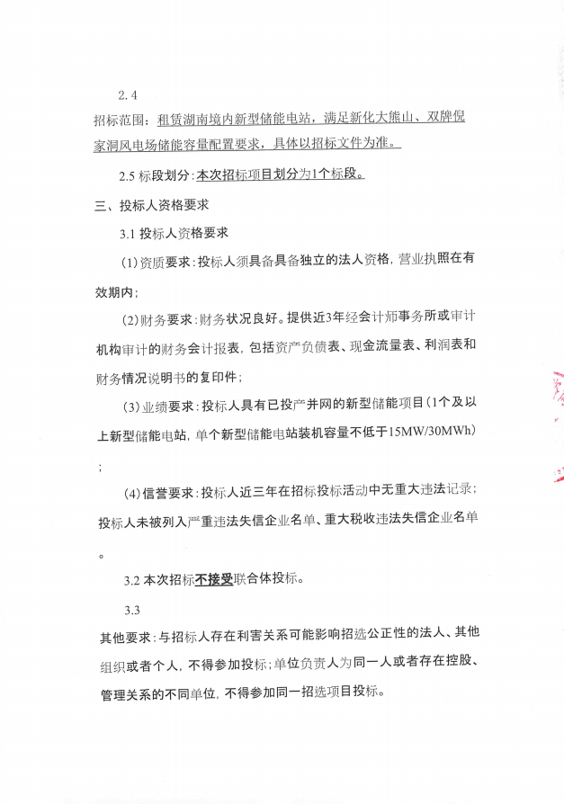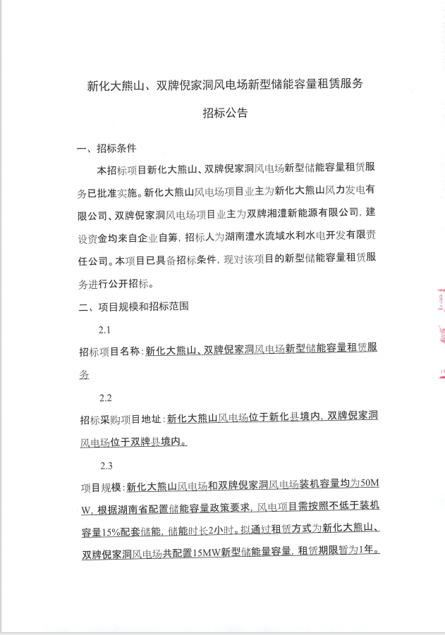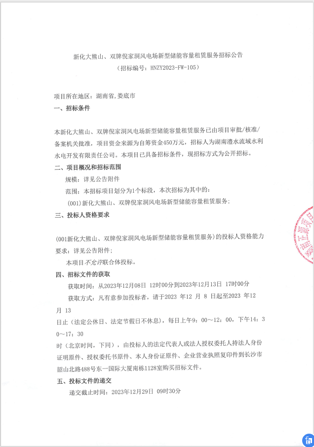 新化大熊山、双牌倪家洞风电场新型储能容量配置租赁服务招标公告 来源:企管部 发布时间:2024-01-26 浏览数: 次 【字体:小 大】 (本公告仅用于司务公开,以招标公告指定发布平台为准) 【打印正文】 分享到: