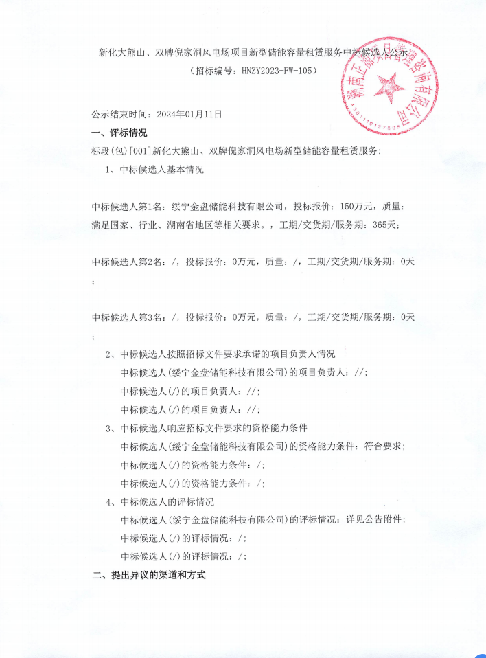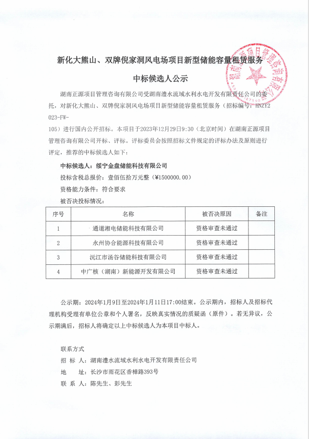 新化大熊山、双牌倪家洞风电场新型储能容量配置租赁服务中标候选人公示 来源:企管部 发布时间:2024-01-26 浏览数: 次 【字体:小 大】 (本公告仅用于司务公开,以招标公告指定发布平台为准) 【打印正文】 分享到:
