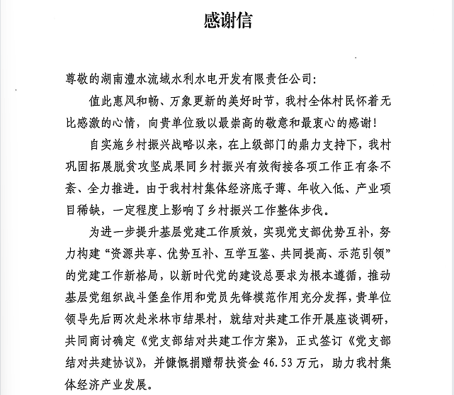 感谢信指出,公司积极践行党的治藏方略,按照水利部统一部署,公司领导先后到结果村调研座谈,确定党支部“资源共享、优势互补、互学互鉴、共同提高、示范引领”结对共建模式,商定《党支部结对共建工作方案》,签订《党支部结对共建协议》,落实结对帮扶资金,优化帮扶项目建设方案,目前帮扶项目已经建成投入使用,有力促进了结果村集体经济发展,展现了公司情系边疆、造福百姓的深情厚谊,村民们发自内心感恩党的好政策,感谢公司的真情付出。